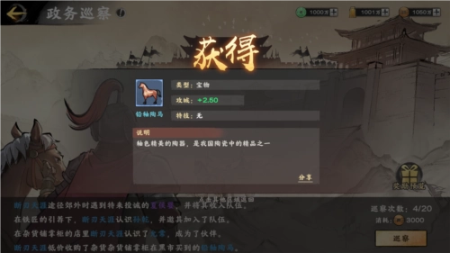 当主城等级提升至8级且成功解锁政务台后,即可前往政务台,通过消耗基础资源进行政务巡查来获取宝物。