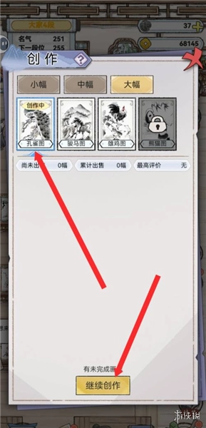 2、接着挑选一幅画作,点击下方的创作按钮,创作四个区域需要消耗墨玉,等四个区域都创作完成后,就可以进行装裱并准备出售了。