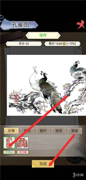 3、进入孔雀图案的创作界面后,点击界面下方的“印章”选项,然后选择“平常心”印章。完成这一操作后,孔雀图案作品的售价会有所提升,具体是在原本1688金币的价格基础上增加10%。