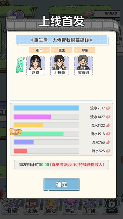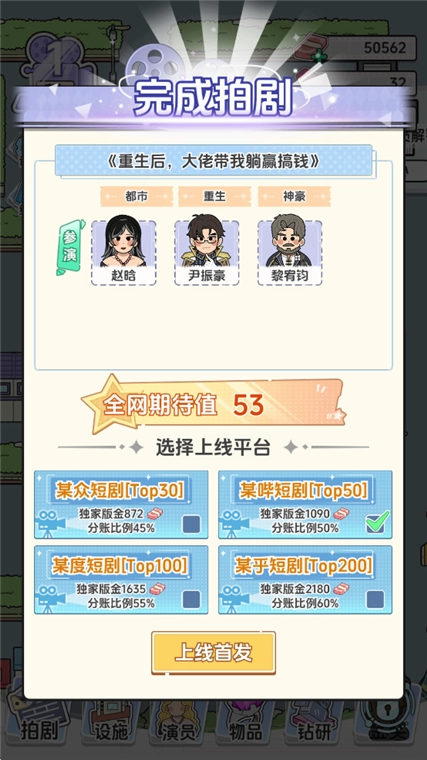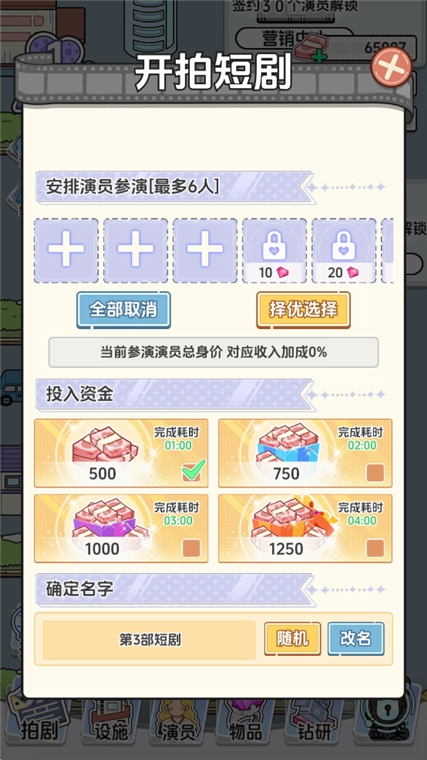 2、选好题材、演员、投入的资金以及名字后,点击开拍按钮。