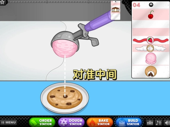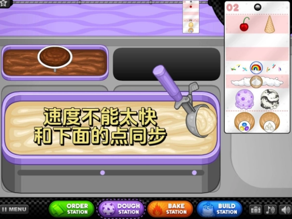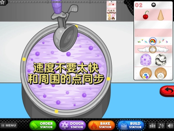 5、你得用手来舀冰淇淋!拖动铲子时要慢一些,尽量让它的速度和篮筐周边那些点的速度保持一致。