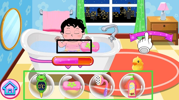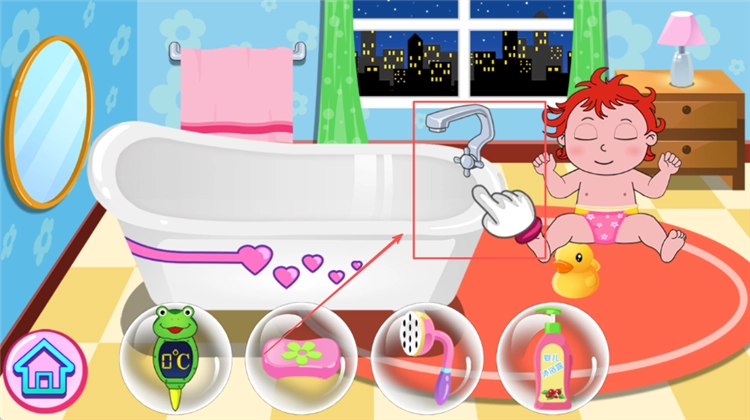 --沐浴洗澡:在浴室中准备好温度适宜的洗澡水,接着通过触摸屏幕、滑动手指的操作,为宝宝涂抹沐浴露或香皂,最后帮宝宝冲洗干净身体。