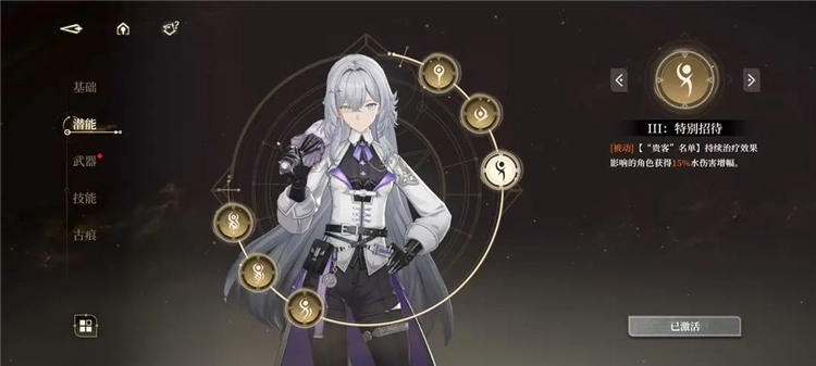 角色定位:白发治疗者,能依据生命值提供暴击伤害加成,对水系目标有额外伤害提升,凭借充足的治疗量可在旧日残影玩法中耗死Boss。