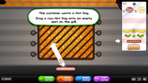 游戏中的热狗制作会随着进程呈现出难易变化:初期阶段,可供使用的食材种类较少,顾客的需求也相对基础,同时客流量不大,因此制作流程较为简单,每个热狗都需要玩家通过鼠标逐步操作完成。而到了后期,食材配料的种类会逐渐丰富,顾客的需求也开始变得多样化,甚至还会出现用餐高峰期。 在规定时间内的具体制作步骤如下:首先要取出一个热狗面包,接着将作为热狗灵魂的热狗肠放在烤盘上烤制至成熟,这一步需要特别注意烤制时间,一旦烤糊,废弃的烤肠扔进垃圾桶会导致金币收入被扣减。烤好热狗肠后,将其放置在面包上,再根据客户的口味偏好进行配料添加——比如喜欢全料的顾客,就需要依次放上芝士、牛肉和番茄酱;如果顾客对某一种配料有忌口,则需将其剔除。完成配料后,将热狗放入装饰盒中,即可递送给客户食用。
