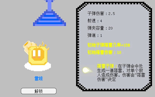 解锁需要675金币,发射的子弹有概率触发落雷并造成伤害,子弹伤害虽偏低,但弹夹容量十分可观。