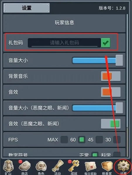 进入“设置界面”后,找到“礼包码”输入框,把刚才提到的礼包码填进去,再点击那个绿色的对勾按钮。