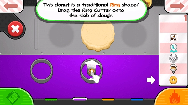 2、第一个操作间为生面团站,制作甜甜圈需要特定形状的生面团,玩家需挑选一块面团放置到工作区域。先用擀面杖将其擀成圆形面饼,再通过模具来完成造型。