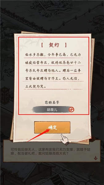 3、从契约内容可知,这家布庄接下来将由自己负责经营打理,点击【确定】选项即可。