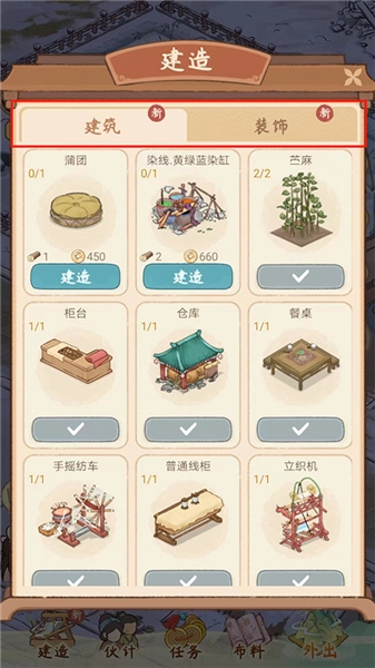 4、进入胡记布庄的主界面,这里设有【建造】、【伙计】、【任务】、【布料】以及【外出】等功能选项,接着点击【建造】这一选项。