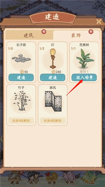 5、进入建造界面后,可看到建筑与装饰两大分类。建筑栏内包含立织机、普通线柜、手摇纺车、餐桌等建筑;装饰栏则有芭蕉树、灯、石子路等装饰。随着等级提升,还会解锁更多建筑与装饰选项,玩家可根据需求自由选择建造或放置到场景中。