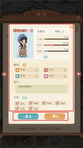 8、进入伙计界面后,会分为已加入和待加入两个类别。点击员工,就能查看其当前的等级、心情、体力、经验、体能、武力、敏捷、技艺以及工作状态,同时可以勾选其工作内容,还能进行遣送或赠礼操作。