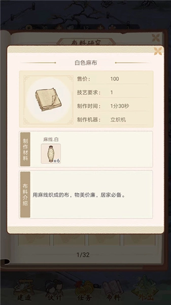 10、进入布料界面后,能看到已解锁的布料类型,点击对应的布料,即可查看该布料的售价、技艺要求、制作时长、所需机器、制作材料以及布料的详细介绍。