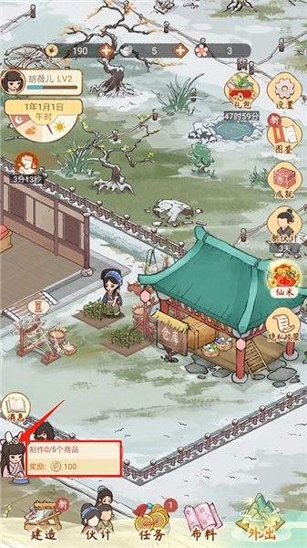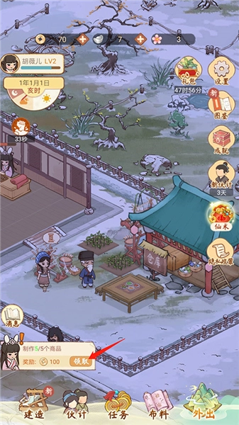 13、回到胡记布庄的主界面,点击【小人物】图标,就能看到对应的任务要求:制作5个商品,可获得100铜钱的奖励。