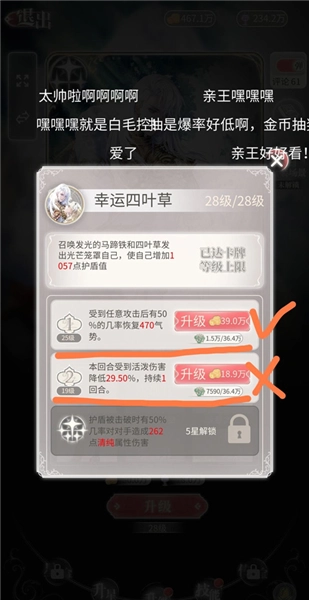 升级那些没有属性偏向的技能时,像《马背上的亲王》这张卡,它的主技能是增加护盾,优先升级主技能是合理的;不过它的技能2是“受到活泼类型伤害时减少伤害量”,建议尽量不要升级这个技能;而技能1是“有一定概率恢复气势”,如果实在没有其他更合适的技能可升级,这个技能也可以考虑升级。