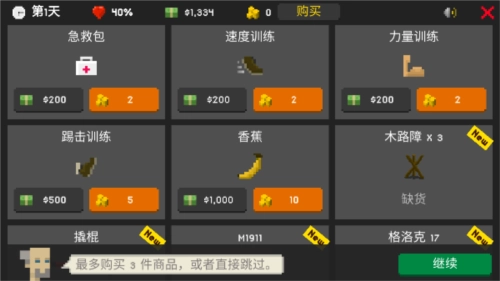 1、进入游戏前,先去商店选购装备。由于小编目前金币还没攒够,最多只能买2件商品。新手开局建议优先选择踢击训练、香蕉皮和速度训练,这些装备能为后续获胜助力。