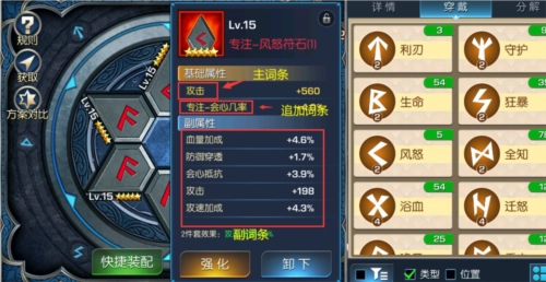 二.光之守望符文词条的选择要点 1. 主词条方面,其属性会随着符石的强化而逐步提升,最高可达到16%,例如攻击加成属性最高能强化至16%。