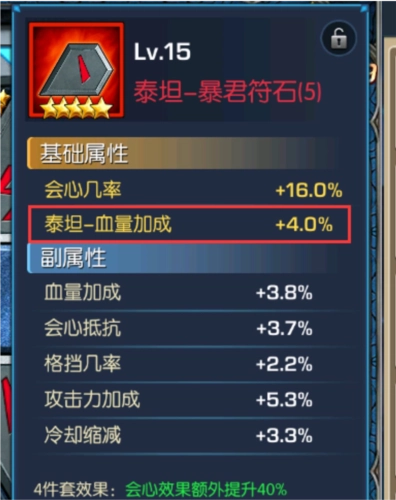 在《光之守望》里,初始红符石的星级通常在3到5星之间。其中,3星红符石带有3个副属性,4星则对应4个副属性——就像下图展示的那样,这块初始4星红符石正好具备4个副属性。由此可见,红符石的初始星级是相当关键的。
