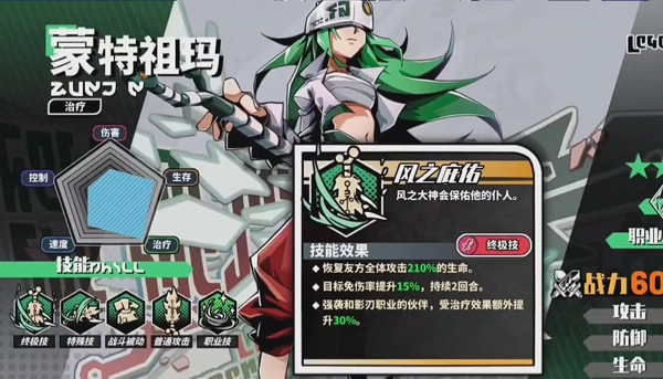 技能上,大招“风之庇护”是群体回复技能,能为友方群体单位恢复相当于其攻击力约210%的生命值,同时让所有目标获得15%的免伤效果,持续两个回合。更厉害的是,这个技能对强袭和影刃职业的队友有额外加成——治疗效果会再提升30%。既有群体治疗又带免伤,遇到刺客或法师这类高输出对手时,治疗效果还能进一步增强,绝对是输出队伍里的关键技能,称得上是相当出色的治疗大招。