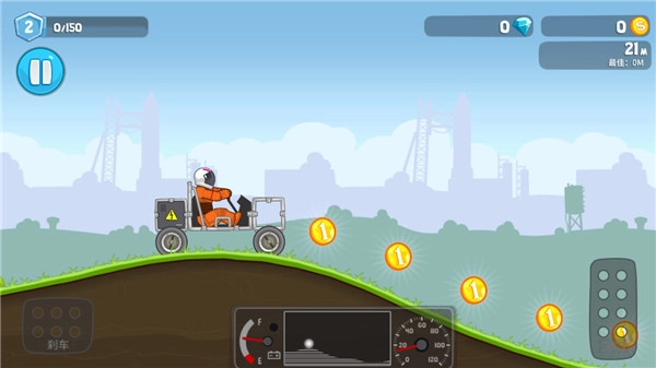 3、把赛车改造完成后就能出发了,左边是刹车键,右边是油门键,要是遇到车头翘起的情况就踩刹车,车尾翘起的话就踩油门,我们的目标就是操控赛车在能量用完之前到达终点,就是这么简单;