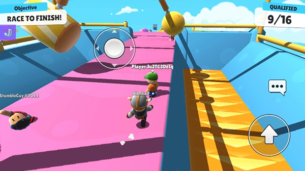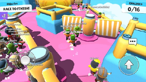 8、玩家需借助虚拟按键操控角色移动,右侧按键单击为“跳跃”,双击则是“向前扑”。游戏设有三轮障碍赛道(地图),每轮赛事结束后,成功抵达终点线或跨越障碍的玩家可晋级下一轮,直至角逐出最终的冠军……
