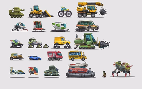 我们设计了21款造型各不相同的载具,每一款都有其独特的属性和移动方式,这些不同的属性能够与前文提到的不同场景里的地面相互匹配,这是玩家在游戏过程中需要留意的要点。这21款载具被划分成从弱到强的C、B、A、S四个等级,对应等级的载具只能在相应级别的站点车库中解锁,不过一旦解锁,所有级别的站点车库都可以使用该载具。