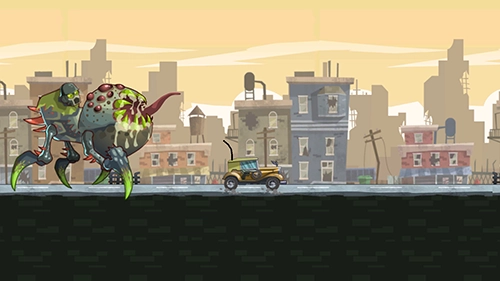 从名字就能看出,这里面肯定有生化怪物。游戏里的生化怪物总共分为7种、2个类别(地面和空中),具体包括老怪、大型生化僵尸、普通生化僵尸、小型生化僵尸、生化虫卵、竹蜻蜓僵尸和吸血蝙蝠。其中,老怪一直待在玩家身后,紧追不放;其他生化怪物则都出现在玩家前方,阻碍玩家载具前进。后方的老怪会攻击玩家(主要方式是吞噬和呕吐虫卵),而前方的地面僵尸和空中僵尸攻击方式都是撞击,被不同的前方生化怪物撞击后,载具减速的幅度不一样;不同的生化怪物被消灭后,给玩家的代币奖励也有差异。所以玩家得选择升级载具,或者换更厉害的载具,再购买、装配威力更强的武器,以此消灭前方袭来的生化怪物,防止它们撞击自己的载具造成速度损失,进而避免被身后追来的老怪吞噬。