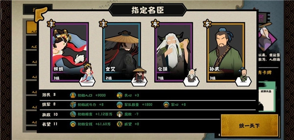 2、这套搭配用到的名臣有嫦娥、女艾、仓颉和孙武。其中嫦娥是首充就能拿到的金将,孙武则是签到七天可获得的金将,女艾是蓝臣,所以这套组合不仅获取门槛低、十分亲民,属性也很均衡。嫦娥能提升人口和兵甲的增长速度,女艾可获取城市信息,方便我们掌握他国动态,仓颉的科技点加成让我们前期就能解锁特种兵,孙武的军事能力更是突出。这套组合集战斗力提升、发展促进、范围AOE技能和科技点增加于一体,堪称万金油配置,适用于当前所有剧本,且实战效果屡试不爽。