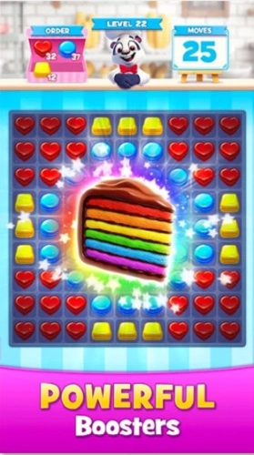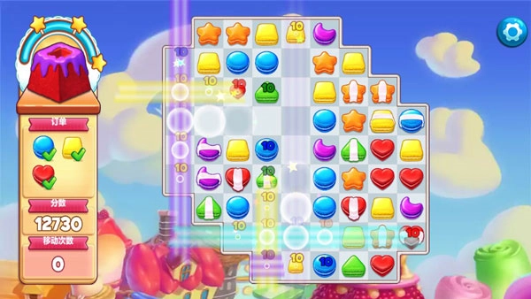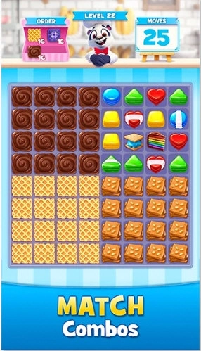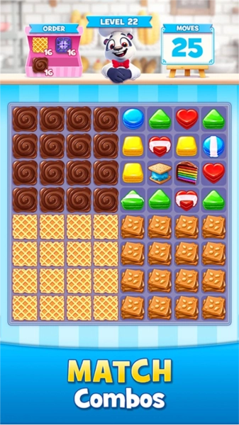 完美遵循经典三消玩法,通过交换相邻饼干的位置实现消除,只有当三个或三个以上相同饼干连成一线时才能消除,消除的数量越多,获得的积分就越高,并且消除后剩余的糕点还能在后续关卡中为你带来额外的积分收益。