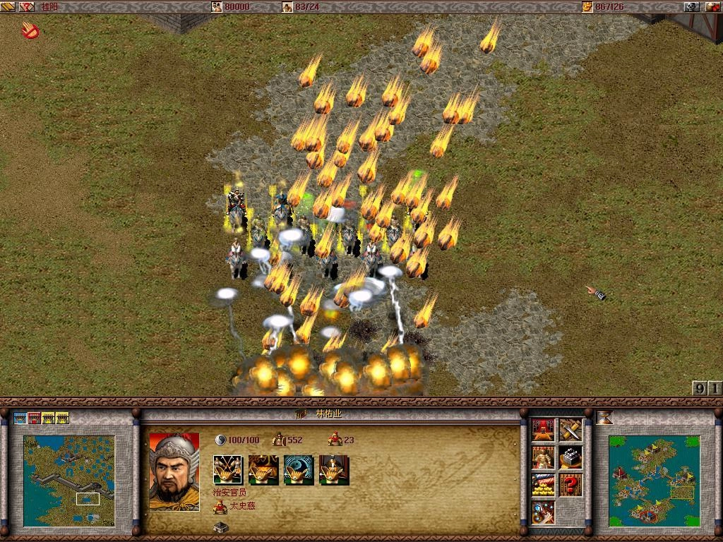但这样还不能确保绝对安全,敌人可能会搭云梯攻上来,这时候你可以安排几个武将、刀兵和枪兵(注意别放弓箭手,他们没法近战,而且要让武将和士兵都骑着马,这样更耐打)。