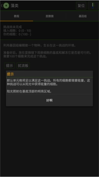 3、玩家在闯关过程中还能查看提示:默认的单元格足以应对该挑战,所有细胞都需要能量,这类挑战中存在可从阳光获取能量的细胞,而阳光会照射在基底顶部的明亮区域。
