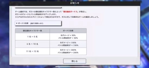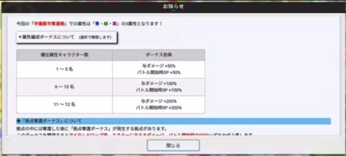 特殊规则:若使用克制b操作系统s颜色属性的颜色属性卡编成队伍,会触发【属性编成奖励】开局时sp会增加,以及队伍会拥有伤害加成。组织战的b操作系统s颜色属性会在开始前公布,可关注消息进行了解。