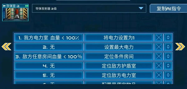例如,这一条的内容是:当我方电力房间出现损坏时,应优先减少导弹室的电力供应,以此尽可能保障其他房间能够正常运行。