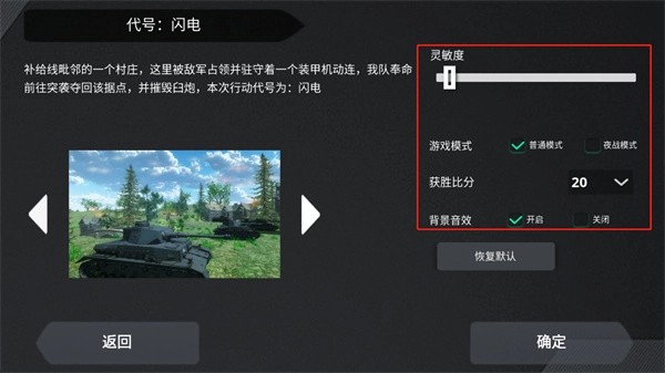 3、玩家还能对灵敏度、模式、获胜比分等进行设置,设置好后点击确定即可继续。