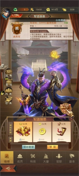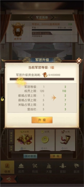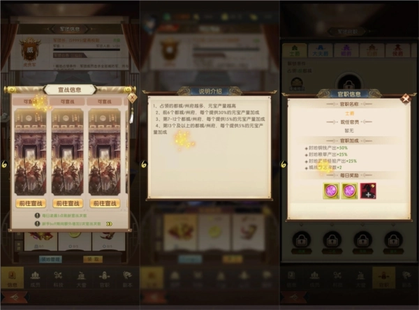 2、在军团城战玩法中,军团长与副军团长有权对已通关的城池发起宣战;占领的城池数量越多,每日能获取的资源就越丰厚。军团成员可将自身部队派驻到军团大营,方便军团长或副团长调遣至各城池参与战斗;而且首次完成部队派遣后,就能完成军团签到。当占领一座都城后,会解锁官职系统,军团长可根据情况为成员分配不同官职;不同官职每日提供的俸禄各不相同,占领的都城越多,解锁的官职等级越高,对应的每日俸禄也会更优厚。