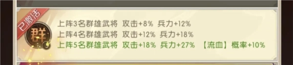 3.阵容加成:当队伍里群雄武将数量超过3名时,每增加一名群雄武将,队伍的攻击和兵力都会得到提升;若上阵5名群雄武将,还能提高流血概率。