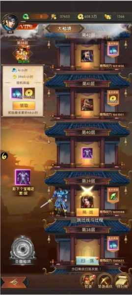 二、扫荡与挂机奖励 主公在通关爬塔15层后,即可解锁扫荡功能。通过扫荡已通关的层数,主公能获得相应奖励,且每日首次扫荡的层数越高,所得奖励越丰厚。而挂机资源获取功能需在大秘境通关30层后开放,主公可通过挂机获取精铁与铜币。需要注意的是,挂机资源最多可累积48小时,主公记得及时领取,避免资源溢出造成浪费。