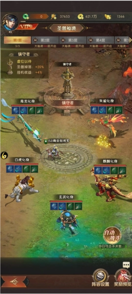 三、圣兽秘境 主公在爬塔过程中获得的装备奖励仅包含防具类装备,首饰类装备需在通关爬塔50层后解锁的圣兽秘境中获取。圣兽秘境里共有五只圣兽,分别对应装备的五个化身,主公每日可击杀化身5次,次数最多可累积至10次。