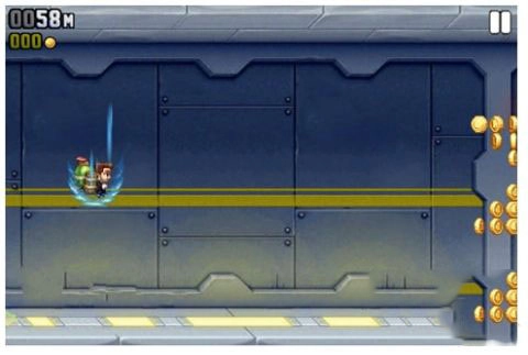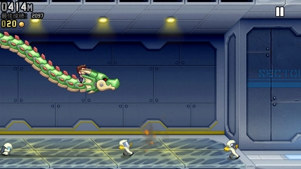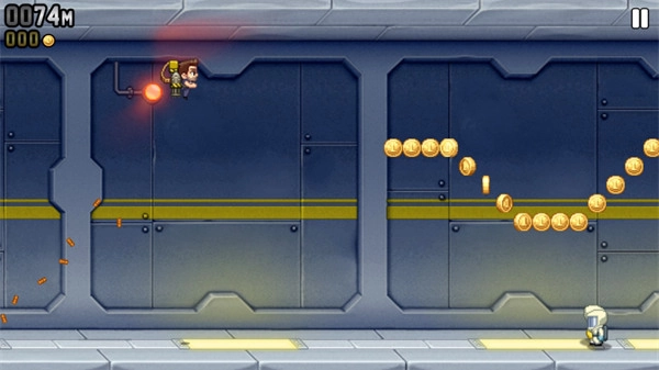 这样做的好处是既能尽可能多地收集金币,又能巧妙躲避电火链。由于电火链可能随机出现在屏幕的各个地方,要是Barry处在高空飞行状态或者在地面奔跑,他能调整的位置范围就比较有限,一旦前方突然出现电火链,往往来不及做出起飞或下落的反应。