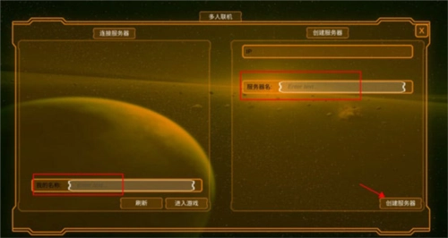 2、输入你的名字,创建服务器,接着选择服务器名称,这样你的小伙伴只需输入IP地址就能进行联机了。