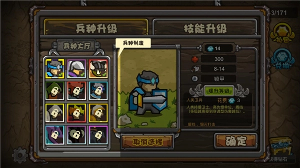 兵种和技能的相关设置都在猎手大厅里。技能升级后,在关卡中就能使用强力技能,但需要消耗钻石,这一点确实挺坑的;而兵种的升级效果是持续生效的。为了能使用更多兵种,建议大家前期快速通关关卡,选择右边的路线推进,这样可以先解锁骑士和猎手。