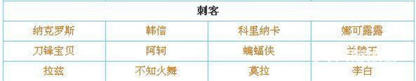 纳克罗斯对应韩信,科里纳卡对应娜可露露,刀锋宝贝对应阿轲,蝙蝠侠对应兰陵王,拉兹对应不知火舞,莫拉对应李白。