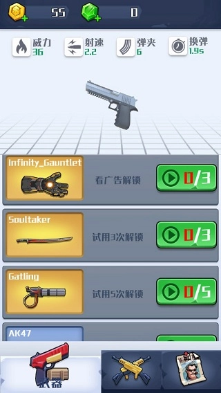 每次通过关卡都会解锁新武器,当进度条填满后,就算没有主动解锁,你也能获得新武器使用。