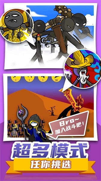 1、组建火柴人战队:进入游戏后,玩家需要组建专属的火柴人战队,挑选各类不同的火柴人士兵,为即将到来的战争做好充分准备。
