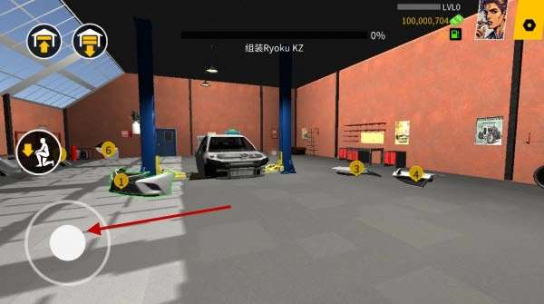 1、在车库内通过左下方摇杆来控制人物移动。
