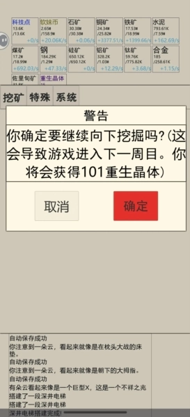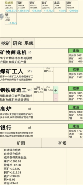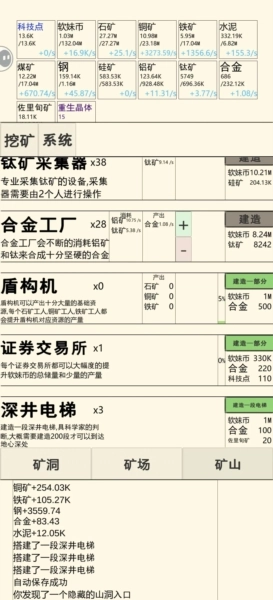 1、《重生挖矿》的核心玩法聚焦于资源的获取与管理。玩家点击屏幕上的“挖矿”按钮,通过模拟开采来获取基础矿石资源。这些资源是发展的起点,为后续的科技研发和设施建造提供了必要的材料支撑。