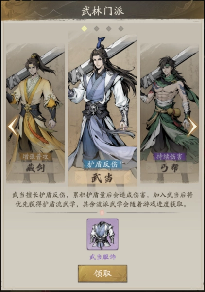武当(护盾反伤):通过累积护盾量对敌方造成伤害,选择加入武当的话,优先学习护盾流武学;这一设定与藏经阁探宝中的护盾流派相对应。