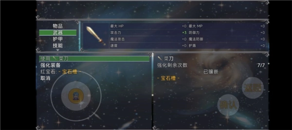 点击返回后,可通过物品→武器/护甲路径,依次选择装备、空宝石槽和宝石;也能选择返回→装备→装备强化→装备增强的路径。需要注意的是,镶嵌的前提是装备需具备对应颜色的宝石槽,宝石槽有红、绿、蓝三种类型。
