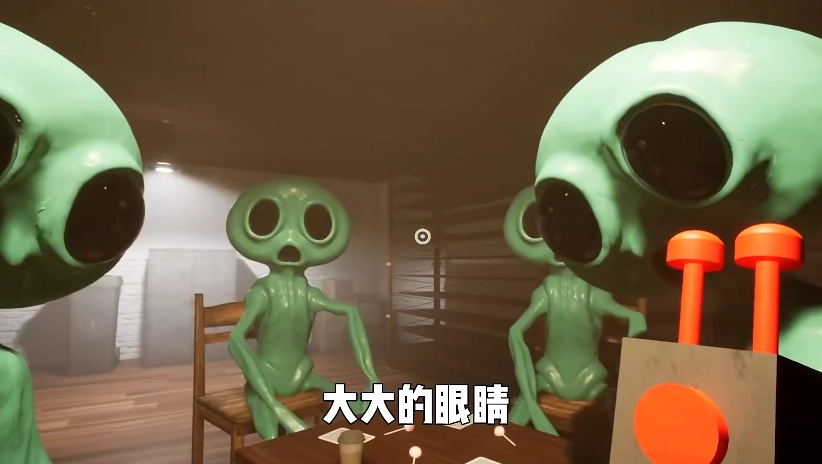 接着镜头切换到主角,他乘坐电梯下到地下,在那里遇到了一群模样古怪的吉祥物,它们的外形看起来有些像外星人。