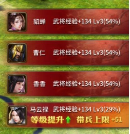 3.橙将获取难度较低,紫将仅需用于初期过渡即可。务必优先安排橙将上阵,原因在于武将的主要经验来源是奇遇和每日任务所提供的上阵武将经验。所以,要确保先让计划培养的武将上阵,再去领取包括奇遇、每日经验、夏侯惇雄才奖励以及雄才盛典卢植奖励在内的上阵武将经验。