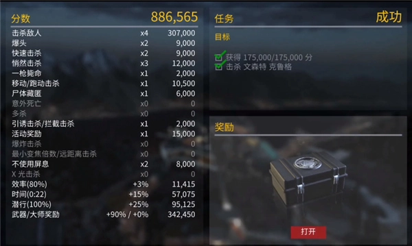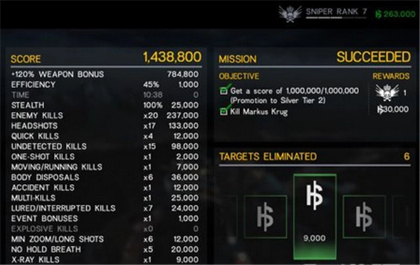 这是一个单纯为了刷分的关卡,建议使用分数加成最高的武器,通过连续的爆头击杀和秘密击杀来获取高分。下图展示了过关的分值构成情况,我使用的枪支是6级的NARCISSUS。